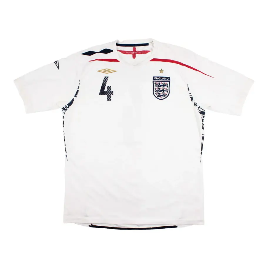 This product is a men's 2007 England football shirt with Steven Gerrard's name and number on the back. Designed in the national team's home kit, this white shirt with short sleeves is suitable for adults and is made by the brand Umbro. It is a perfect piece of sports memorabilia for fans of English football and collectors of football shirts.